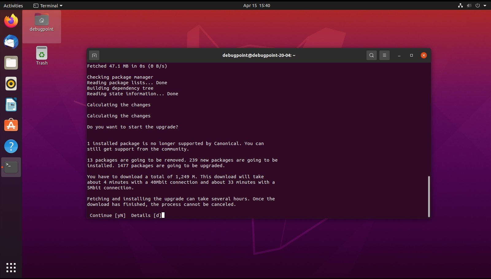 In addition to that, keep a watch on the terminal for occasional prompts which require your input as Y/N. Also, if you cancel the upgrade process midway, the third party PPA will not be enabled. So, you have to enable them manually.